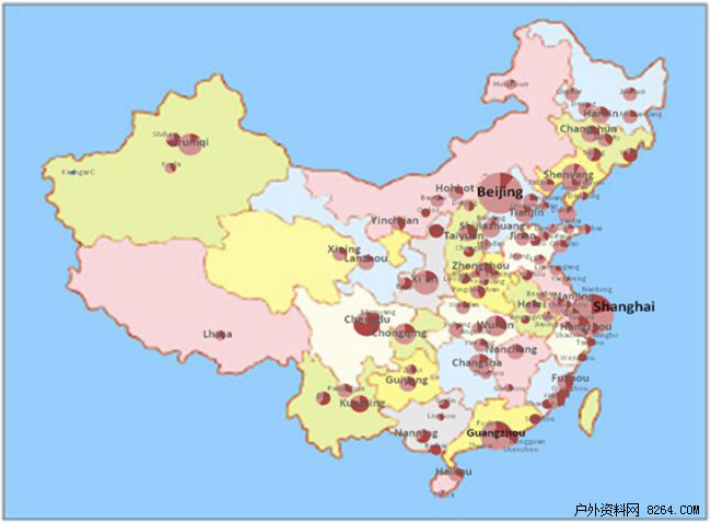 从这张图可以清楚地看到国内户外用品市场的分布情况。西部是我国山地户外资源最丰富的地区,是人们户外旅行的目的地。但是,户外用品市场主要分布在东部经济发达地区。