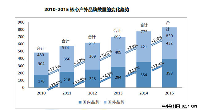 我们组织业内专家,在 1,200 余个户外品牌或自称“户外品牌“中,确定 830 个为核心户外品牌。 2015 年国内核心户外市场品牌数量保持持续上升的势头,较 2014 年度的 775个增长 7%。其中,国内品牌数量为 398 个,占品牌总数的 47.95%,增长率为 12.4%;国外品牌数量为 432 个,占品牌总数的 52.05%,增长率为 2.6%。国内品牌增长率高于国外品牌增长率,新增国内品牌中,80%为以网络销售为主的所谓“线上品牌”。