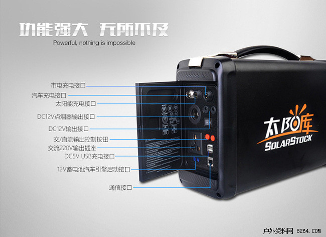 太阳库便携式太阳能发电箱,或者叫大型充电宝、大容量太阳能移动电源,该设备可通过太阳能发电,集发电、触电、输出于一体,内部有600Wh的电量,储存于锂离子电池中。设备交直流两用,还有DC12V汽车点烟器输出接口和DC5VUSB输出,汽车应急启动功能,非常适合车载使用。