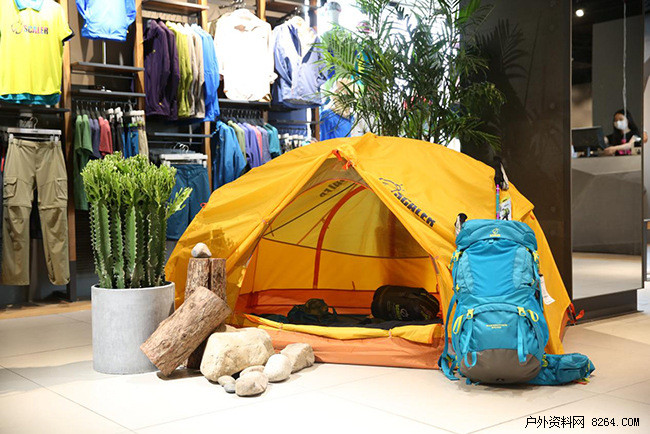 进门后,原来的两个可以移动的大木箱已被宽旷的露营生活的场景替代,专业的高山帐、60L的大背包、登山杖和山石、绿植一起,栩栩如生地构造出一幅户外露营生活的画卷。"我们希望用这样的场景来唤起大家更多户外生活的共鸣!"场景之外,是思凯乐当季的产品系列,安静地在墙面货架上,以不同的色彩和款式期待着一场知遇的旅程。