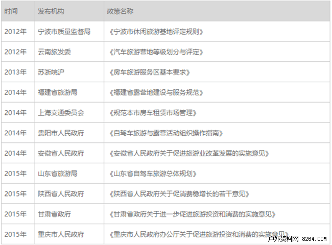 除国家层面大力扶持露营旅游产业发展外,地方各级政府也纷纷对这一朝阳产业制定规范、鼓励政策,以培育区域经济增长新动力。其中,《山东省自驾车旅游总体规划》提出自驾游发展的关键就是自驾游配套和政府的单项规划,对自驾游存在的现实问题具有重大的指导意义。此外,陕西、甘肃、重庆等省市都明确提出规划建设一批房车营地,重庆市还提出了具体目标:到2020年在全市规划建设自驾车房车营地50个。