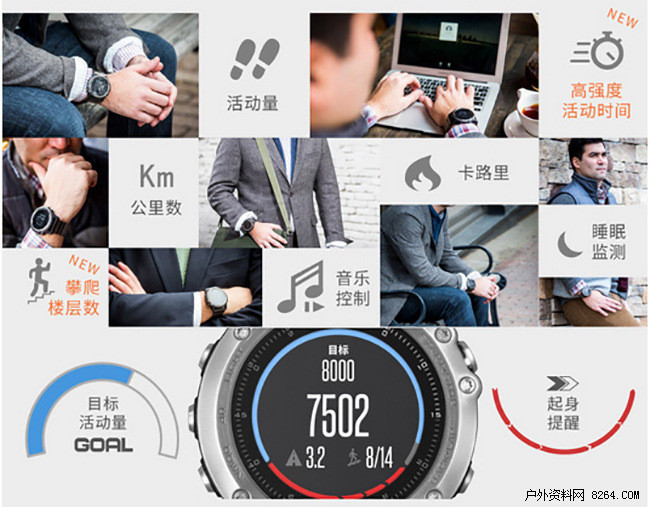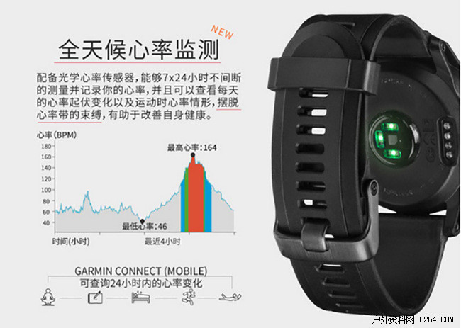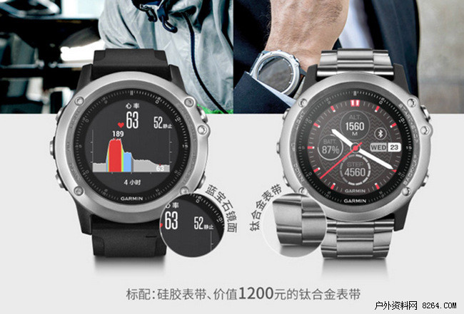 在功能方面,fenix3HR提供了跑步、骑行、游泳、登山、滑雪、高尔夫、划船等户外运动模式,fenix3 HR不仅可以进行GPS导航和原迹返航功能,还可以显示方位、海拔、气压、经纬度,甚至是当前的温度,包括日出、日落的时间都可以提供。