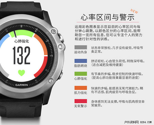fenix3 HR是一款支持光学心率监测技术的GPS腕表,可显示心率区间与警示,通过图表形式直观地显示用户当前的运动状态,譬如当心率处于蓝色色块时表示脂肪正在燃烧,处于橙色色块时表示肌力强化,而处于红色色块时则表示用户目前处于无氧状态。