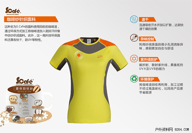这种名为S.Cafe的面料使用回收的咖啡渣,通过环保方式加工成面料。该面料有强大异味控制效果,可提升超过50%的快干效率。咖啡渣天然的微小孔洞是紫外线最好屏障,可提供比纯棉高达5倍以上的紫外线防护效果。快干、防UV又环保。