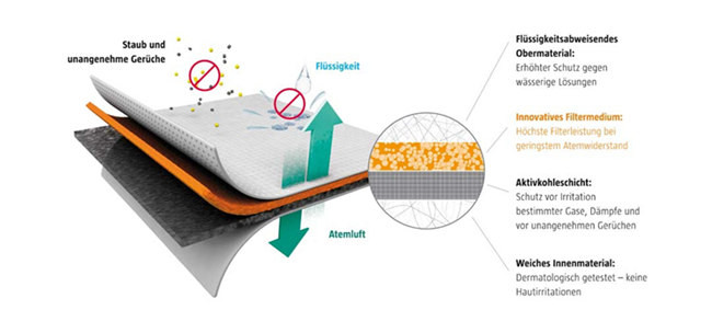 上层液体防水(材料):增加抵御水的解决方案。创新的过滤介质:最小呼吸阻力拥有最大过滤性能,活性炭层(245cv)免受特定的气体、蒸汽和有刺激性的不良气体。内部柔软材料:皮肤学测试—没有皮肤过敏。