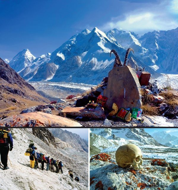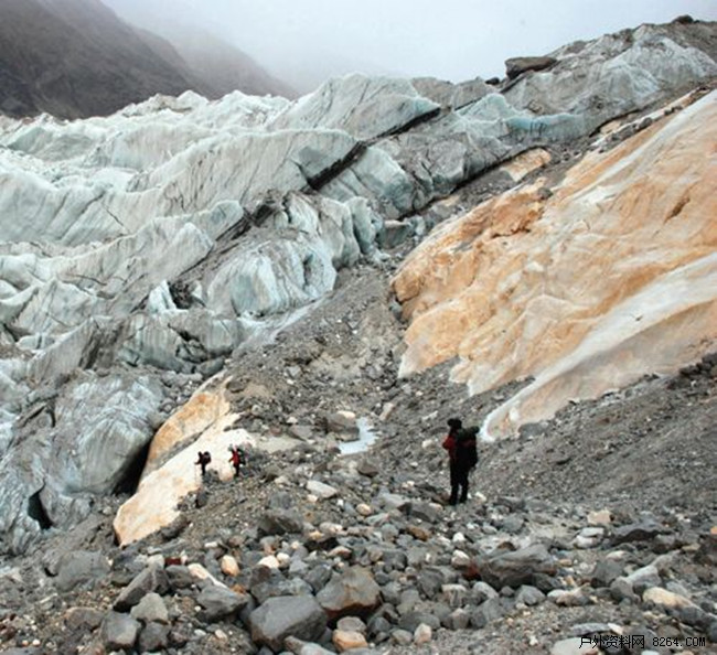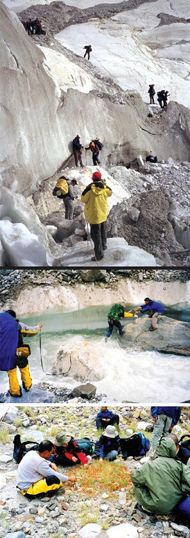 下午,浓厚的雾气从远处的山谷里开始向上蔓延,潜在的危险又在向我们逼近。所剩无几的食品也不允许队伍再有任何担搁,我告诉大家,我们没有时间了,在冰川上多耽搁一分钟便多一分危险,如果天黑前跨不过冰川,整个队伍就将陷入极度的危险之中,为了活命,我们只有拼了。为了节省队员的体力,我凭借自己的冰上经验走在最前面探路,在确定线路安全准确后才让全队通过。为此我体力已严重地透支,以至于在过最后一道冰河时他差点出了意外。杨华也因为一直尽力协助我来回运送队员及他们的背包,也造成体力透支,跳跃冰河时险些落水。
