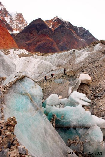 探险队向无名墓告别后,我带领大家沿昨天侦察好的线路踏上了冰川。木扎尔特冰是我们所见过的最可怕的冰川,冰块的挤压运动,在裂缝交错的冰川上隆起了小山似的冰塔,冰川的融化,在不足2公里宽的冰川上冲出了三条又宽又深的冰沟,沟底咆哮的冰河震耳欲聋。当队伍一绕过了几个大冰缝后,被第一条冰河挡住了去路,要想通过必须寻路下到沟底,这对没有穿冰爪的队员来说是非常困难的,如失手滑到冰河里,那将是致命的。走在前面的我过河时,脚下一滑,一屁股坐在冰水里,虽然队友陈祥书及时将我拉起,但我的照相机和背包还是进了水。过第一道冰河后,队伍沿一条较平缓冰川向西快速行进,半小时后又被一条巨大的裂缝挡住了去路,为了安全起见,队伍又退了回来。由于队伍中新队员占多数,跨越这样险恶的冰川的确是难上加难。杭州来的小姑娘兮兮,从来都没有见过冰川,更不要说在冰上行走了,在冰川上杨华大哥时刻都照顾着她,惟恐她发生意外。队伍在冰川上蠕动了四个多小时后到达了冰川彼岸的乱石岗,由于数百年的冰川的消融和冰川的拔石作用,和冰川接壤的山体塌陷,在险要地段古道早已不复存在,取而代之是山体塌陷形成的乱石岗。行走了两个多小时后,队员已是精疲力尽,为了踏上古道,我带3名队员爬上左侧100多米山坡,终于在山坡上面找到了古道,董务新队长带大部分队员继续沿乱石岗行进,一个多小时后,道路起伏更大,行进更加困难,无奈,队员们从非常陡峭的山体爬上了古道。