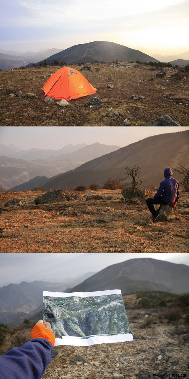 2、事前用谷歌地球、天地图、百度地图等做了大量的功课,在没有向导的情况下,根据网络搜索到的信息,大胆确定了登山的入口和营地,并规划了第二天沿山脊徒步的路线,同时,打印了天地图的高清卫星影像作为地图使用。事实上,实地的情况和预测完全对应,增加了solo出行的信心。