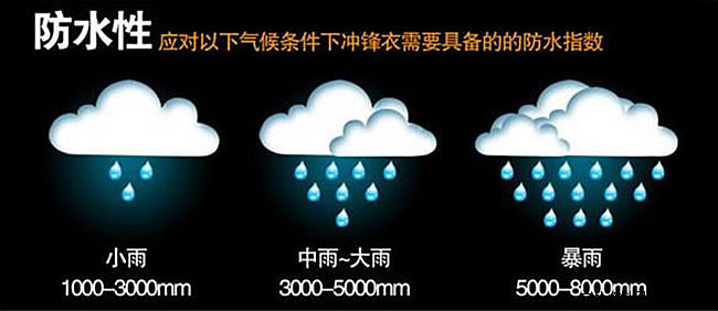 防水指数(单位:mmh20,毫米水柱压):简单来说防水指数为10000mmH2O的面料可以让10000mm高的水柱压在上面,24小时内从面料渗出的水不超过3滴。各种强度防水指数的性能可直观地参照上图。