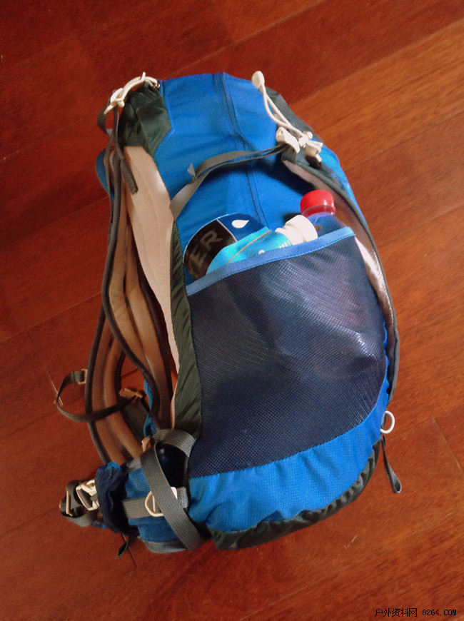 背包的水壶袋还空着,塞入一瓶矿泉水,因为这个包没有水袋仓,所以我一般是不带水袋的。
