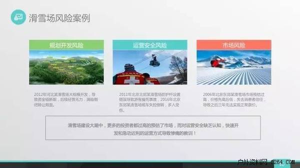除规划开发与硬件设备两个方面存在风险外,也要重点考虑市场与政策两方面的风险,北京某雪场因价格体系混乱,失去消费者信任,导致多年的雪票价格体系混乱。