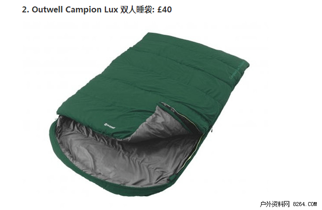 如果你在露营的时候想念你自己的床了,那你就会喜欢这款睡袋。睡袋内置了一件羽绒被,睡觉时也有足够的活动空间。不过它包装起来还是很省空间,能很容易地放进包里。适合春季到秋季使用,唯一的拉链位于睡袋正面,用来控制睡袋温度。跟大部分Outwell的睡袋一样,这是一款针对家庭露营者的睡袋,不太适合背包客。