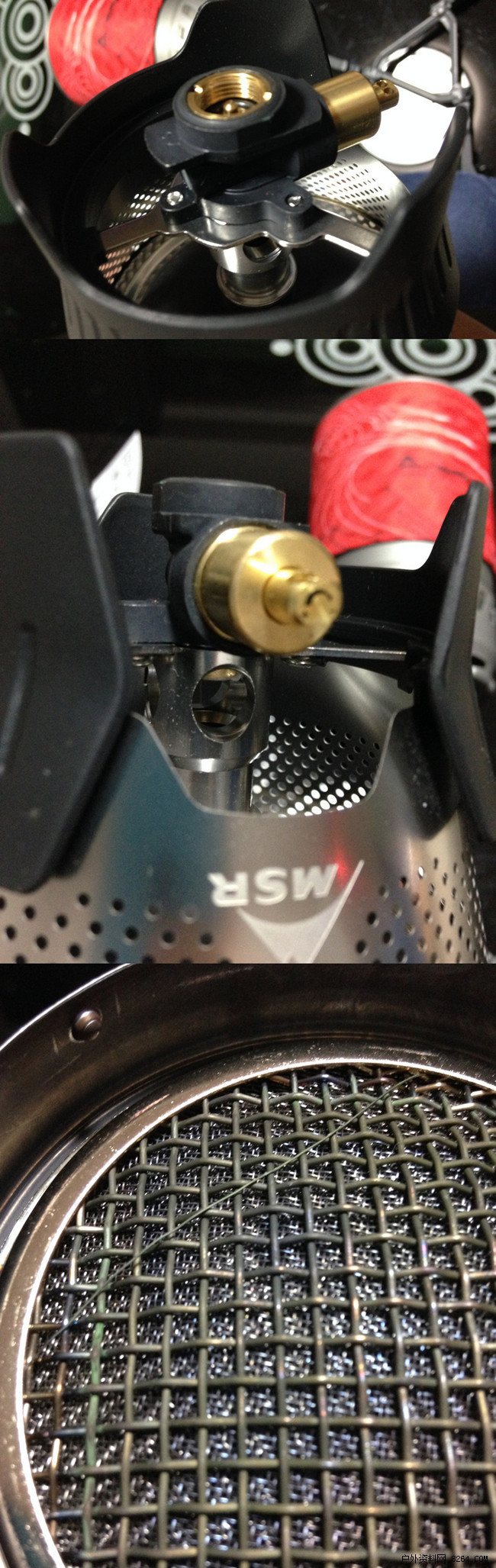 下面是炉头细节:对比Jetboil来说,喷嘴和混合腔看似没什么区别,很担心防风性,炉盘不是反应堆那种石棉材质,成本降低,也减少了扑锅堵掉的可能性,不过开大火时总会有火星升腾出来,不知道是不是因为“筛网”不够致密造成的。也没看到类似JB的“稳压装置”,也许也有一定原因。