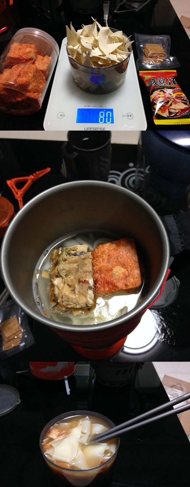 关于吃:是时候煮点东西吃了。一体系统其实挺局限的,不适合煎炒烹炸,不适合食量过大的人儿使用。我之所以选择这个还是我能接受只吃煮食和脱水食品(山之厨,山屋)。500ml水,80g面片(上次煮了50g没够吃)脱水汤料,脱水辣白菜,脱水肉……先煮面,微火对于W来说是件难事……避免扑锅的方法就是随时离火或者煮开后关火焖一会儿再开火烧开再焖一会儿……
