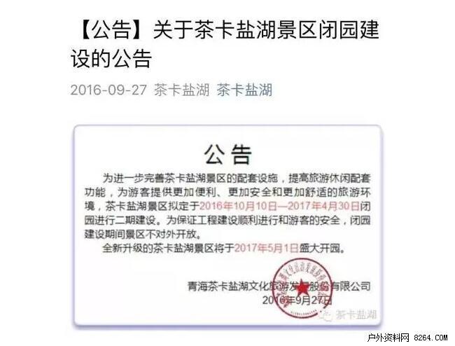 近日,茶卡盐湖官方公告,景区将在2016年10月10关闭景区,全新升级的茶卡盐湖将在2017年5月1日盛大开园。除了10月后茶卡盐湖进入淡季的原因外,还有一个重要的原因就是,随着茶卡盐湖名气越来越大,景区的游客猛增太多,景区的承载能力还需要进一步提升才行,所以才关闭继续升级。