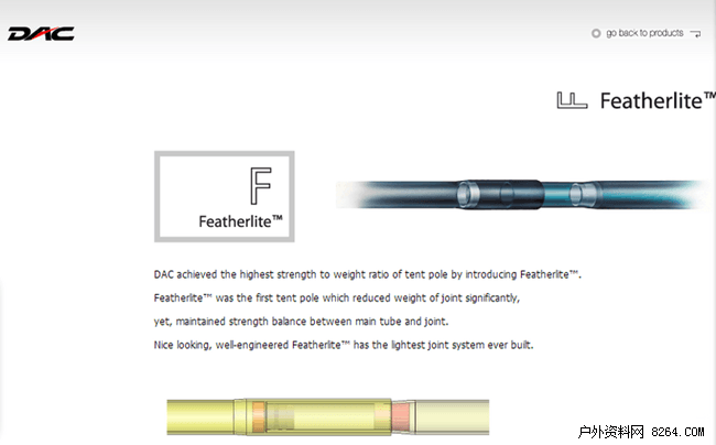 由于对金属处理的技术有别,所以即便同样是铝制帐杆,性能也有很大的区别,比如帐杆的强度、韧性、重量、做工等,当然了优质帐杆和普通帐杆劣质帐杆的价格成本差异也很大,从数倍到十数倍不等。我们以现在全球最为大牌的帐杆提供商——DAC为例来进行说明。DAC在高端帐篷品牌中的地位好比GORE面料之于户外服装大牌,它是韩国的一家公司,现在世界顶级和一线的帐篷品牌,如HILLEBERG、BIG AGNES、MSR、SD、MARMOT、BD等,以及国内的个别帐篷品牌如自由之魂等,都经过DAC授权,可以采用他家的帐杆(不是谁想用都可以的,市面上有不少打着DAC帐杆LOGO的仿货)。DAC的帐杆具有几大优点:轻、强、精。在同样粗细的情况下,DAC可以做到最轻,像不少轻量化著称的帐篷如BIG AGNES、TERRA NOVA等都采用了他家的F NSL帐杆才得以实现;在轻的同时,DAC的帐杆还具有很高的强度,拥有很好的韧性,提升了帐篷的可靠性,减少了断杆发生的几率;此外DAC帐杆做工也很好,切口断面的处理很细腻,不像一些低端帐杆毛毛刺刺容易刮花帐篷,整体质感非常精细有如工艺品。而反观一些做工毛糙的劣质帐杆,强度低容易导致折断,重量大导致使用者负重增加,在表面处理甚至还有毛刺存在,对帐篷的面料可能造成伤害。