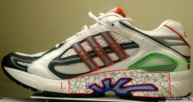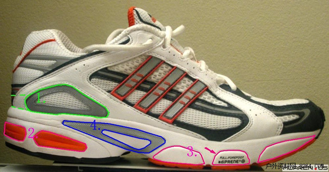 2和3都是个夹芯结构,2的红芯里灌的是硅胶,3的白芯里灌的是泡沫橡胶。就像NIKE的气垫一样,2,3都是很好的防震结构。阿迪达斯还专门起了个名字:2叫adiprene,3叫adiprene+ 呵呵。箭头指示的小字表明这宽鞋的前脚掌全部都是adiprene+结构,这当然就很舒服啦。