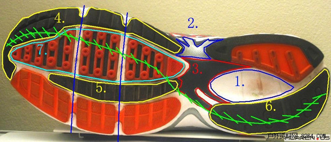 4,5,6是炭素橡胶,7是热塑材料。7耐磨而且轻,所以阿迪达斯也给它取了个名字叫quick strike,简称QS。而鞋底的其它橙色部分,由于不需要太耐磨,采用了比较软的吹制橡胶,相当于给脚加了一层软垫。