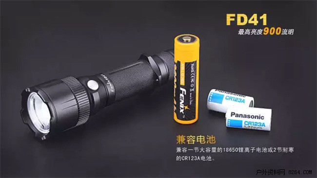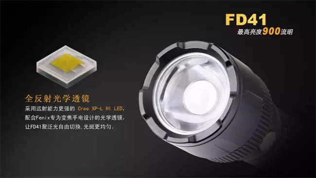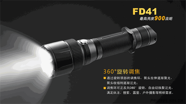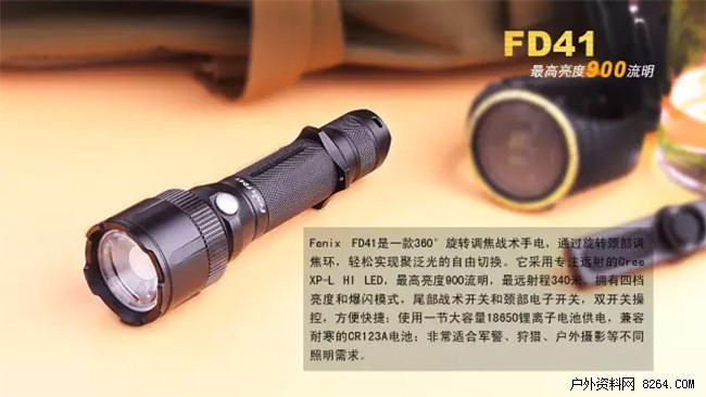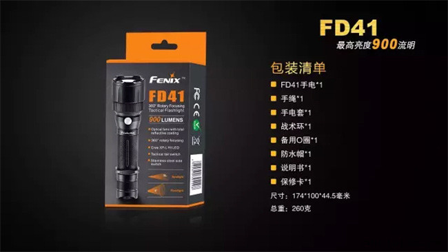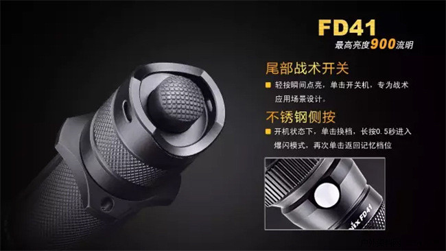 Fenix FD41是一款360°旋转调焦战术手电,通过旋转颈部调焦环,轻松实现聚泛光的自由切换。它采用专注远射的Cree XP-L HI LED,最高亮度900流明,最远射程340米。拥有四档亮度和爆闪模式,尾部战术开关和颈部电子开关,双开关操控,方便快捷;使用一节大容量18650锂离子电池供电,兼容耐寒的CR123A电池;非常适合军警、狩猎、户外摄影等不同照明需求。