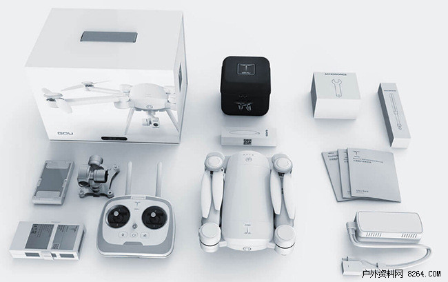 整个无人机里面带有Byrd 机身、Byrd Advanced 遥控器、三轴增稳云台、标配4S 14.2V 7000 mAh高性能锂电池、八对螺旋桨(备用一套)、充电器以及挂绳组成。