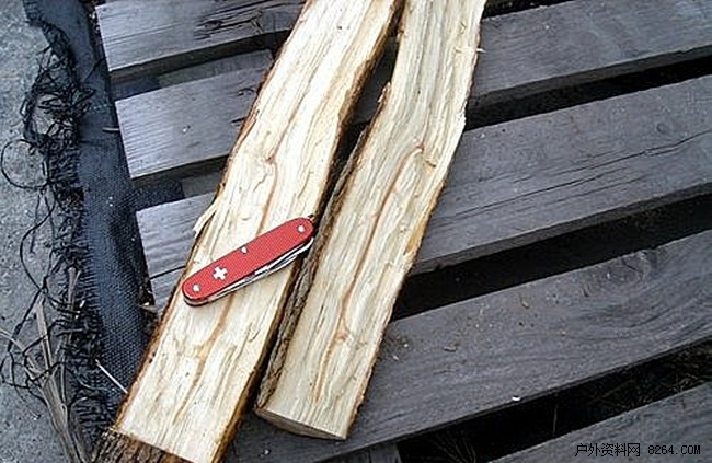 就会有四段只有原先一半长度及厚度的木头。此时你可以选择重复这个步骤将木头劈的更细,或使用另一个户外用刀的基本技巧:batoning