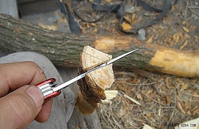 在刀子的上端插入木契或是在这个例子中:石块,敲击它就可将木头劈开(这个石头造型不错可以做成石斧,下次有机会再来示范如何用刀子,木头及石头做一把石斧)
