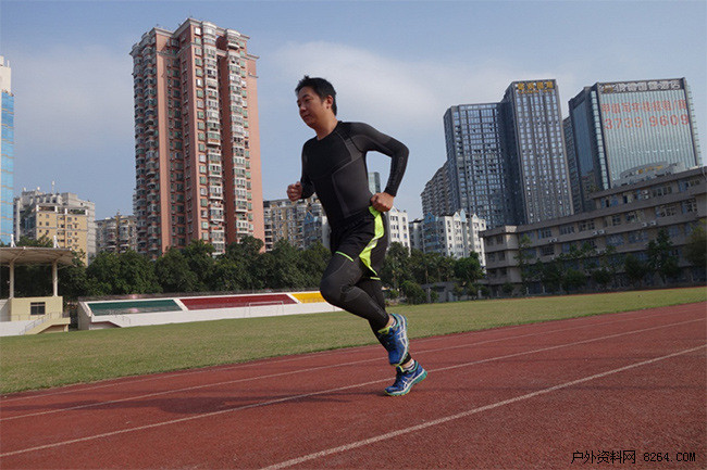 连续跑了二十分钟,前十分钟的速度到达9km/h,中间速度进行达到6.5km/h,处于恢复状态,慢慢调整呼吸。最后三分钟进行冲刺,速度大概为9.5km/h。每一部分都在考验内衣的性能。以往穿的运动衣在第一部分后汗一定透湿全身,但这次汗水明显少了,排汗效果真的很好,而且不会感觉很闷热。