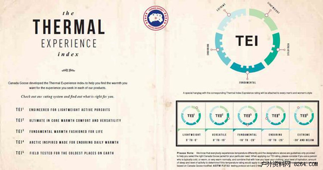 而且 Canada Goose 还建立了一个TEI(Thermal Experience Index)系统来标注羽绒服适合的环境温度。TEI1-TEI5适应从「适合各类活动使用、轻量化」到「实际测试适用于地球上最寒冷的极地」。从数字上就可以一目了然每一件羽绒服的保暖程度了。