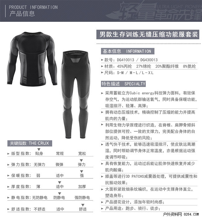 此次测评的装备是生存训练无缝压缩功能套装。在此之前网上几乎没有任何介绍,官方给予的描述是:采用蓄能立方Cubic energy科技弹力面料,有效保存空气,为运动肌群输送氧气,同时具备保暖功能,提供吸湿排汗、保暖、聚能功能。
