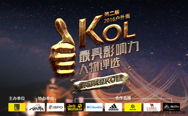 2016年,由8264主办的第十一届中国户外产业年度评选将于11月22日正式开启。作为年度产业评选中的重要奖项,15年首届TOP100中国户外圈最具影响力KOL评选活动为户外大咖提供了良好的展示平台,辐射近百万户外圈爱好者,活动最终选出全国前100名户外精英领袖助力户外领域发展,传递户外正能量。