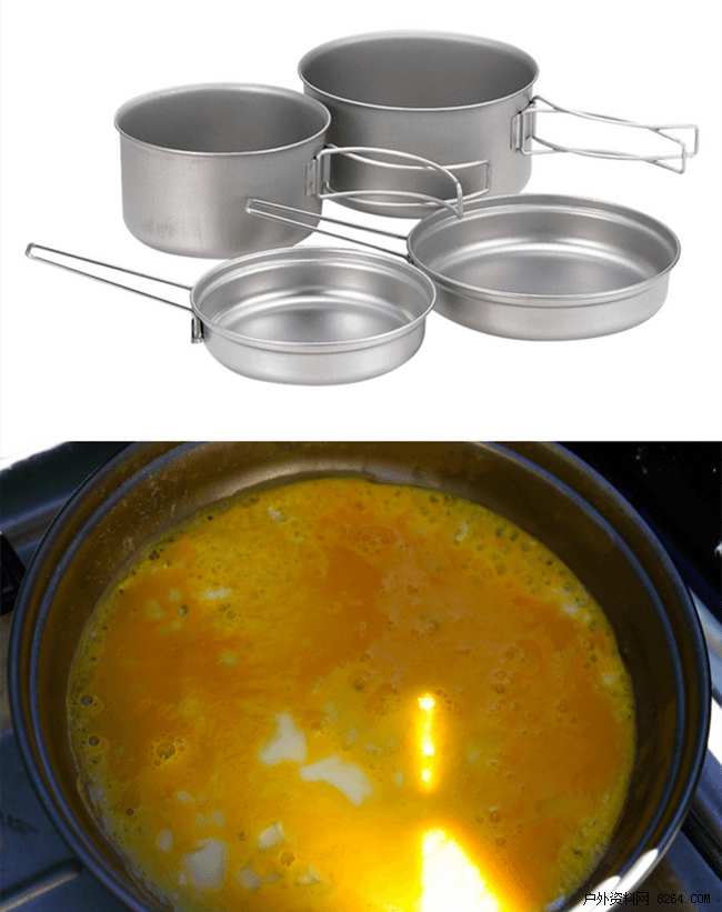 炒蛋测试,表现最糟糕的是MSR Alpine 2 Pot Set, the G4Free Outdoor,和雪峰钛锅,导热不均,蛋都糊在锅底了。表现最好的是两个GSI锅,特氟龙涂层使得蛋不粘锅,导热均衡