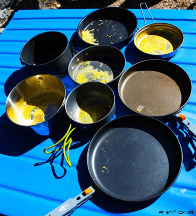 表现最差的是MSR Alpine 2 Pot Set,雪峰钛锅和GSI Outdoors Pinnacle Backpacker Cookset,雪峰钛锅太小了,跟个小孩茶杯似的,虽然我们很喜欢Pinnacle Backpacker的烹饪性能,但我们并不喜欢带它,因为特氟龙涂层不耐用,GSI Outdoors Bugaboo Camper Set比Pinnacle好点,因为比较适用于自驾露营,它的套件是最多的,分别有2个煮锅和煎锅,尺寸大的足以准备4人份食物。