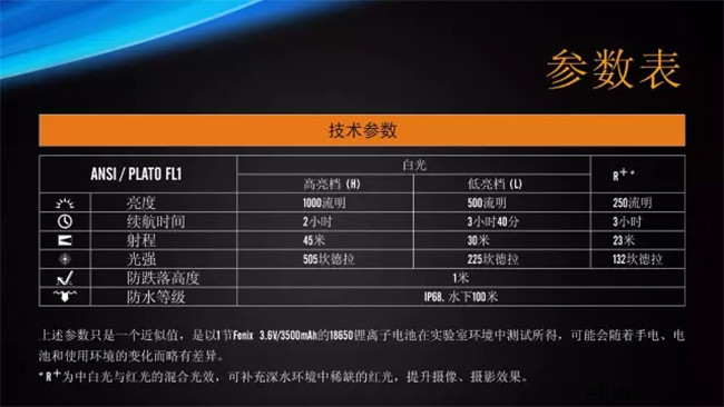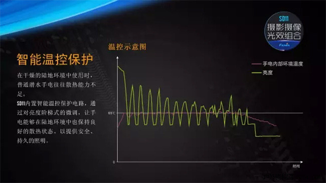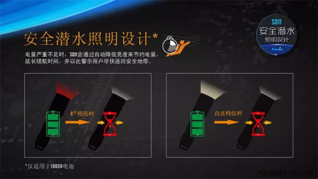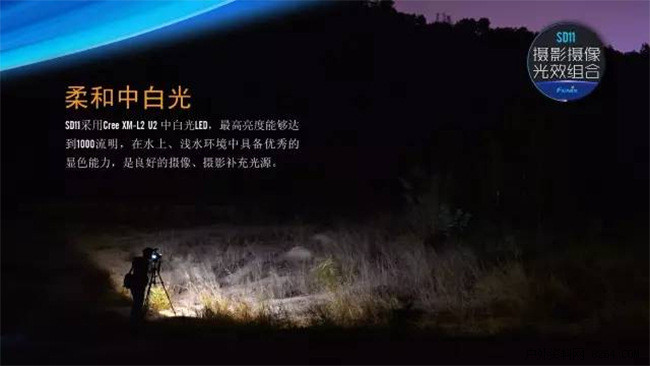 Fenix SD11是一款专为潜水、摄像、摄影爱好者设计的磁环调光手电。其创新设计的“R+”档位——中白光与红光的调和光效,可以在保证亮度的同时,补充水下尤其是深水环境中稀缺的红光,从而使水下景观显色更真实,摄影、摄像效果更好。其采用的Cree XM-L2 U2 中白光LED,配合大泛光光学设计,可满足陆上、浅水区的摄影补光。