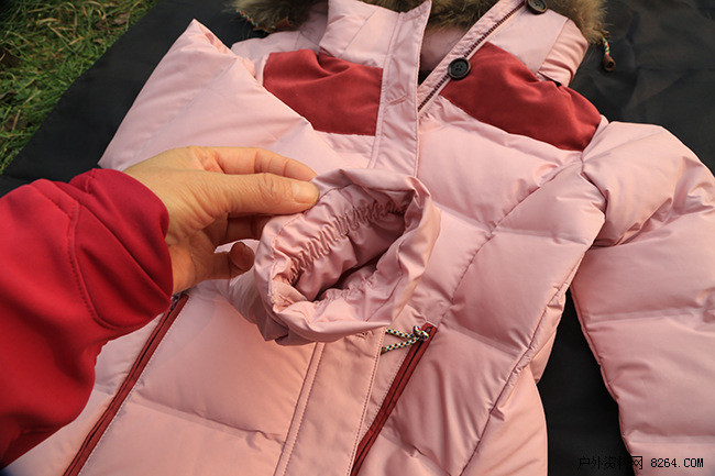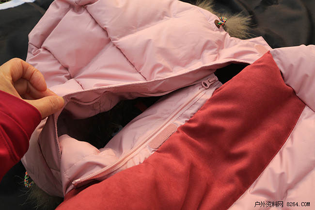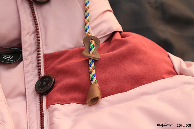 这件灰粉色罗瑞尔女式无缝羽绒服,拿到手后的第一印象就是感觉比较休闲时尚,肩膀处拼接了舒适的麂皮绒,有较强的视觉效果,貂子毛的帽檐和花色拉绳设计,与门襟和衣袖的复古木质纽扣以及皮标相呼应。