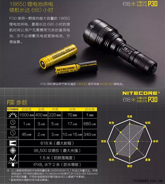 全归功于P30内建的CREE XP-L HI V3高性能发光体,搭载奈特科尔晶亮电镀(PDOT)光杯,充分发挥远射和高亮的能力,才有如此强劲的远射能力呀!刺透黑暗、穿透迷雾都不成问题,分分钟让黑暗的户外亮如白昼。