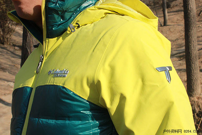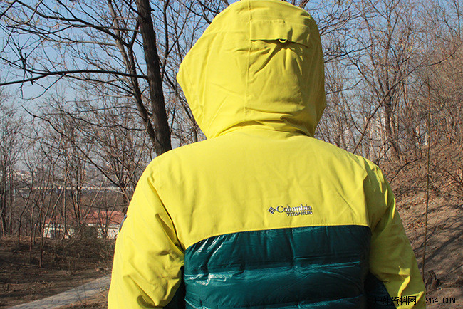 防风帽也是根据运动员戴上安全头盔以后进行设计的,即使头上有安全头盔,这件轻绒夹克的防风帽也是可以戴上的。防风帽的后面带有防风绳调节装置,可以有更好的包裹性能。从下图可以看出防风帽的空间其实真的比较大。背部也有Columbia闪闪发亮的钛金LOGO标识。