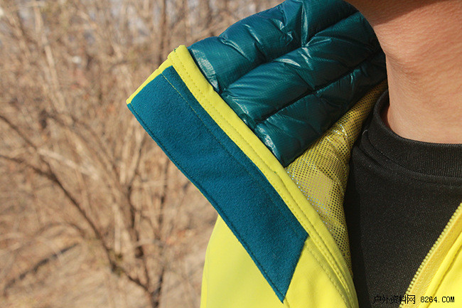 这款倍暖轻绒夹克的外层是采用了两种面料拼接而成,颈肩和臂膀采用了类似于轻质软壳面料,面料成分为87%锦纶和13%的氨纶,面料轻盈柔软,手触摸具有磨砂的感觉,这款面料应该起到的就是保暖和透气的作用。其余的面料则是采用了防撕裂尼龙面料。