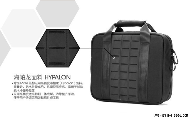 装备包背面有海帕龙材料所做的Molle系统,也可搭载其他附包等实现可扩展。优质尼龙表面经过涂层处理,手感好且还能防水防污,清洁只需要用湿布擦拭即可,使用非常方便。