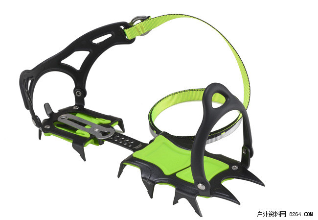 2.全绑式冰爪:全绑式冰爪是利用几条织带将冰爪绑在鞋子上的。其最大优点就是可以配合任意的登山鞋使用而不受限制。然而缺点就是首先固定牢固程度不如全卡冰爪,第二就是当行走一天了之后织带容易冻住,会变的很难摘下。