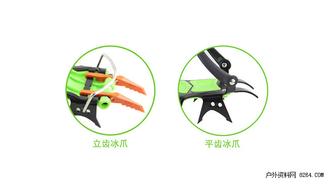 第三点是针对10齿以上有前齿的冰爪而言,这种冰爪分立齿和平齿两类,立齿冰爪是为了攀登垂直或近乎垂直的冰壁而设计的。平齿则是为了平地行走而设计。偶尔也可以用来攀登。(平齿指的是登山爪前齿是平齿,因一体压出生产快。立齿指的是前两齿用了坚硬锻造的直齿,便利踢入硬雪和冰。)