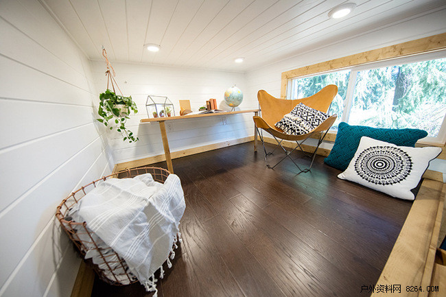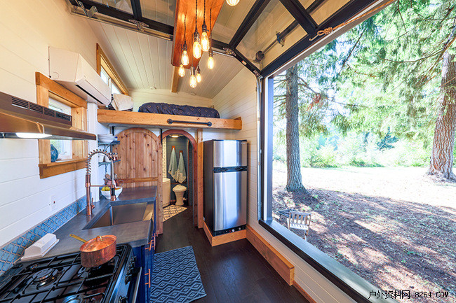 客户决定他们想要缩小规模后,委托tiny heirloom建立一个可移动且奢华的家。 主要通过标准前门进入居住区,一个更大的车库式的门通往外面的世界。内部架构包括中央位置的厨房,侧面的用餐区,高架客厅,浴室和升高的睡眠空间。