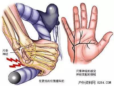 不戴专业骑行手套握弯把或手变位置均会压迫、过度延伸尺骨神经,引起尺骨神经病变(Ulnar neuropathy)。