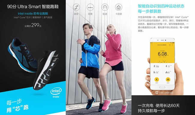 这款小米90分Ultra Smart智能跑鞋由上海润米科技有限公司研发,芯片由英特尔提供(Intel Curie芯片是基于32位英特尔Quark微控制器的可穿戴式解决方案,并自带加速计和陀螺仪的6轴组合传感器),充电一次续航时间可达60天。