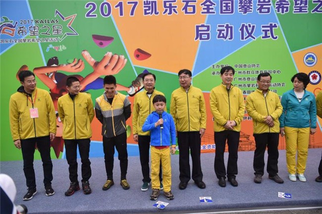 2017年3月25日,2017年凯乐石全国攀岩希望之星活动暨广州站邀请赛欢乐启幕,启动仪式在广州天河体育中心举办,国际攀联副主席、中国登山协会主席李致新及广东省体育局局长王禹平、广州市体育局局长罗京军等一众领导出席了启动仪式。另外,2015年度国际攀联世界杯总冠军钟齐鑫作为特邀嘉宾也出席了该仪式。150名来自全国各地的攀岩小选手们见证了全年活动大幕的开启,并参加了广州站的交流比赛。本次参赛有获得去年攀岩希望之星称号的高维岳,有不远千里从银川、上海、长沙等地赶赴赛场的选手,也有大力推动攀岩运动发展的中山菊城小学等珠三角周边攀岩希望之星承办单位积极参与,在广州市户外节的大力推动下,作为全年系列活动的开端,启动仪式别开生面,引人入胜。