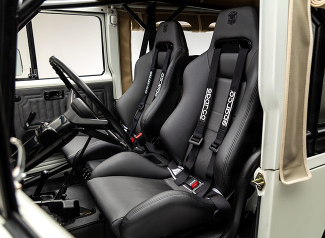 车内完全保留原作的一切精髓,当你坐进这款FJ43里面时,你会惊讶的发现自己完全从那个古老的年代穿越了。无论是仪表盘的造型还是挡把、分动箱切换挡杆都是当年的风情。后视摄像头,蓝牙,数字化仪表盘,LED环境照明灯以及高级音响等现代化的科技配置一应俱全。此外,运动座椅的装配显得更加高大上,中控台的开关都进行了改造,犀牛牌车罩也有效的避免了剐蹭和灰尘。