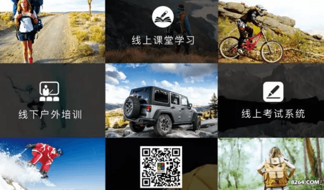 2017年8264将原有的全国露营大会下线户外分享、攀冰交流会、滑雪公开赛、极限映像季等品牌活动进行整合提炼,与10余个领域的户外大咖级别讲师倾力联合,力争打造出中国最具影响力和实用价值的大众户外学校,让更多的普通人正确、安全、积极的参与到户外中来。致力为户外爱好者提供一个线上学习考试系统,线下户外培训平台。
