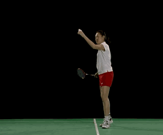 发正手球时左手拿着羽毛球平举放在胸前,眼睛余光看看对方的站位,然后左手松开羽毛球,眼睛要盯好球的下落路线。