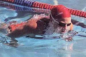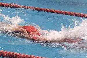 4.全力向游泳池的终点游进。此时头部开始向下,这样手臂向前摆动会比较灵活。