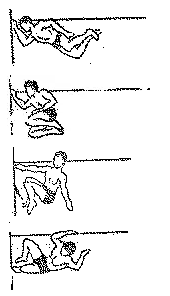转身触壁后,全手掌压池壁,随着惯性屈肘、屈膝团身,同时身体沿纵轴向左侧转动,并抬头吸气,左手离开池壁在水中随着身体向左侧转动并逐渐向左前伸。当身体转至侧对池壁时,头向前进方向甩、并低头入水,右臂推离池壁,从空中摆臂,同时提臀使两脚触臂,两手经颏下前伸,两腿弯曲准备蹬壁(如下图)。