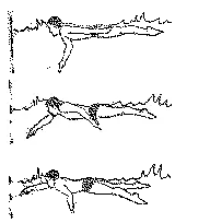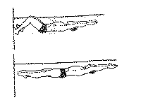 滑行与开始游泳蹬离池壁后,身体保持流线型姿势向前滑行,并继续转成俯卧,当感觉速度下降时立即打腿并划水,升到水面游泳(如下图)。